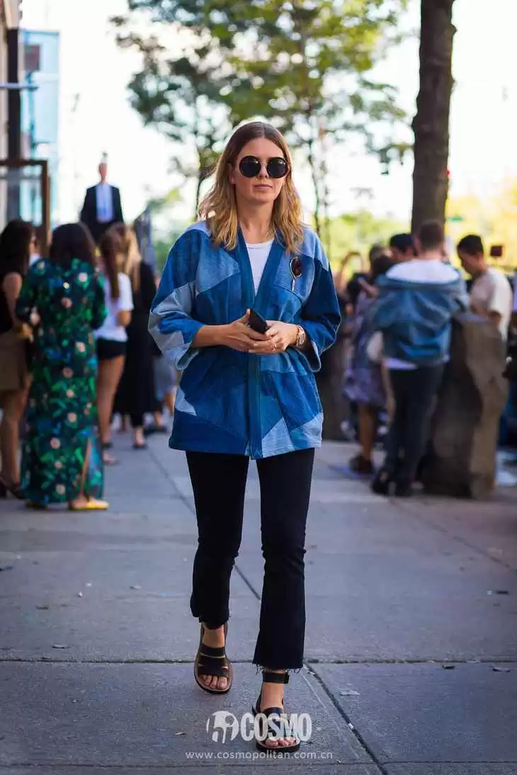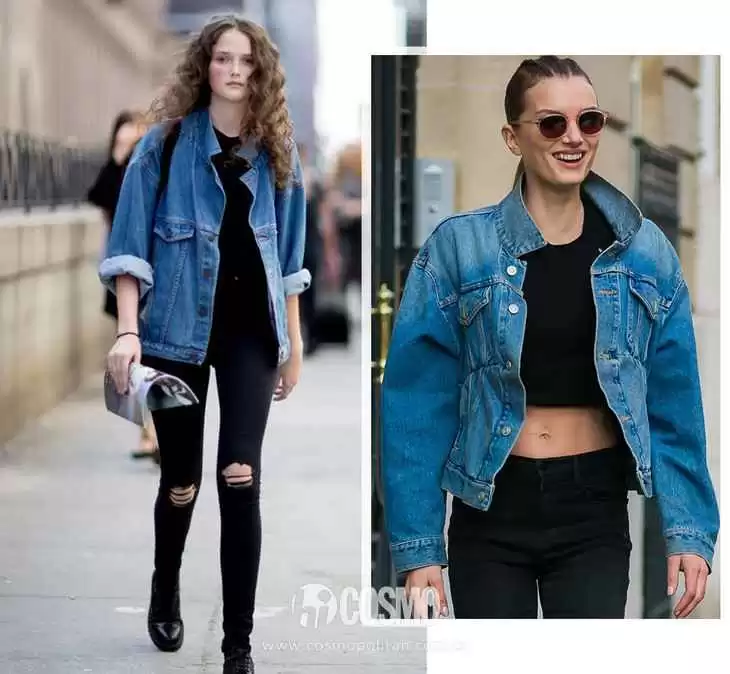 牛仔上衣配黑裤子最实用,两种单品都带点帅气,搭配起来利落干练,永远不过时。