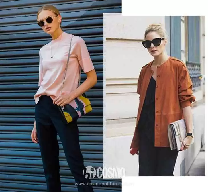 虽然天气还热,但秋天快到了。秋天时,黑裤子搭配深色外套很好看,内搭可以选浅色单品来平衡色调。