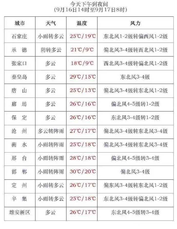 今天下午到夜间,保定、廊坊以南地区阴有小雨或阵雨,其中石家庄西部、衡水东部、邢台、邯郸东部局部有中雨,其他地区多云间晴。最高气温方面,张家口、承德、保定西北部在9到24度之间,其他地区25到31度。最低气温,张家口、承德、秦皇岛北部、保定西北部0到10度,其他地区11到20度。