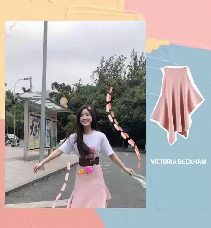 要同时满足以上要求又能穿出少女感,推荐T恤配高腰A字裙。像赵露思这样用白T搭裸粉色不规则半裙,清爽又元气,少女感满分。