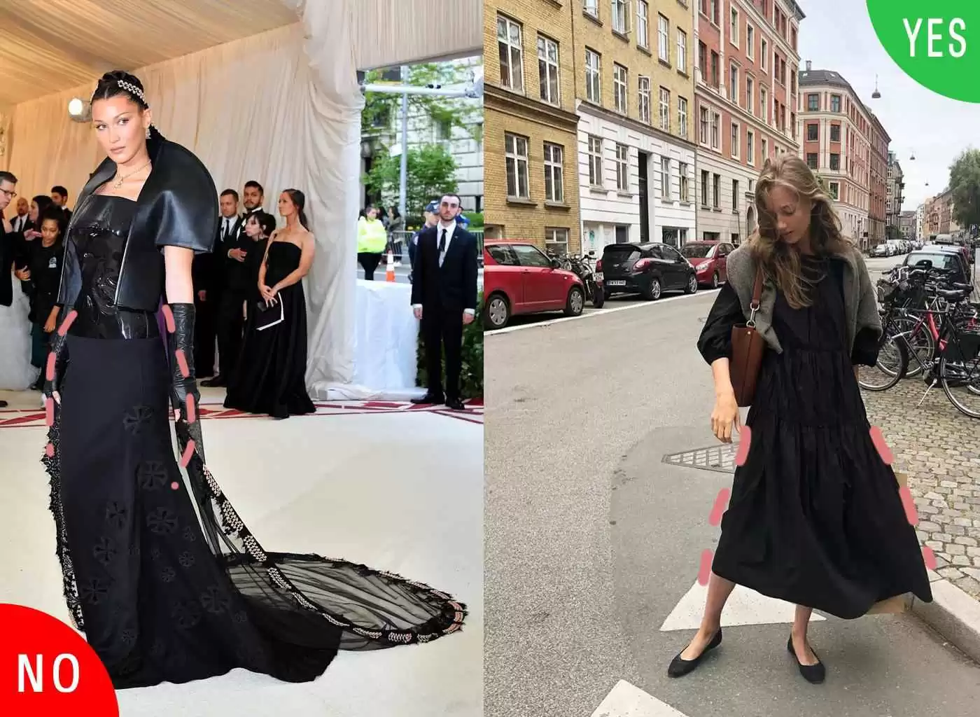 白色泡泡袖衬衫是热门少女单品,但沙漏身材最好外搭黑色吊带裙,只露出泡泡袖部分。黑色裙子显瘦,整体又甜又酷。