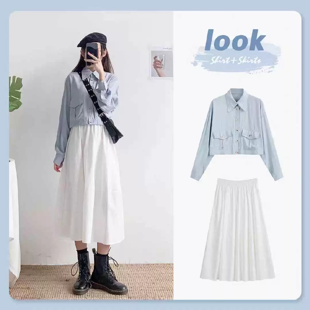 白色长裙配上蓝色上衣,看起来更清爽。搭一双黑色马丁靴,甜酷风十足,简直太吸睛了。想让造型更时尚,建议配一顶贝雷帽和一个简约斜背包,立马加分。