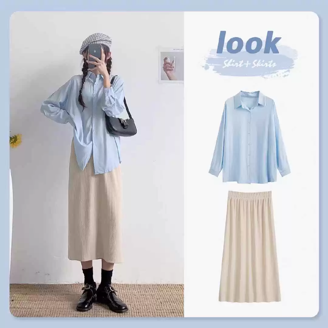 浅蓝色衬衫搭配杏色半身裙,穿出甜美女人味,超减龄。高级的蓝色加上温柔的杏色,把淑女气质完美展现,斯文又有韵味。可以试试双马尾辫造型,更显可爱,配个今年超火的腋下包,精致度up。