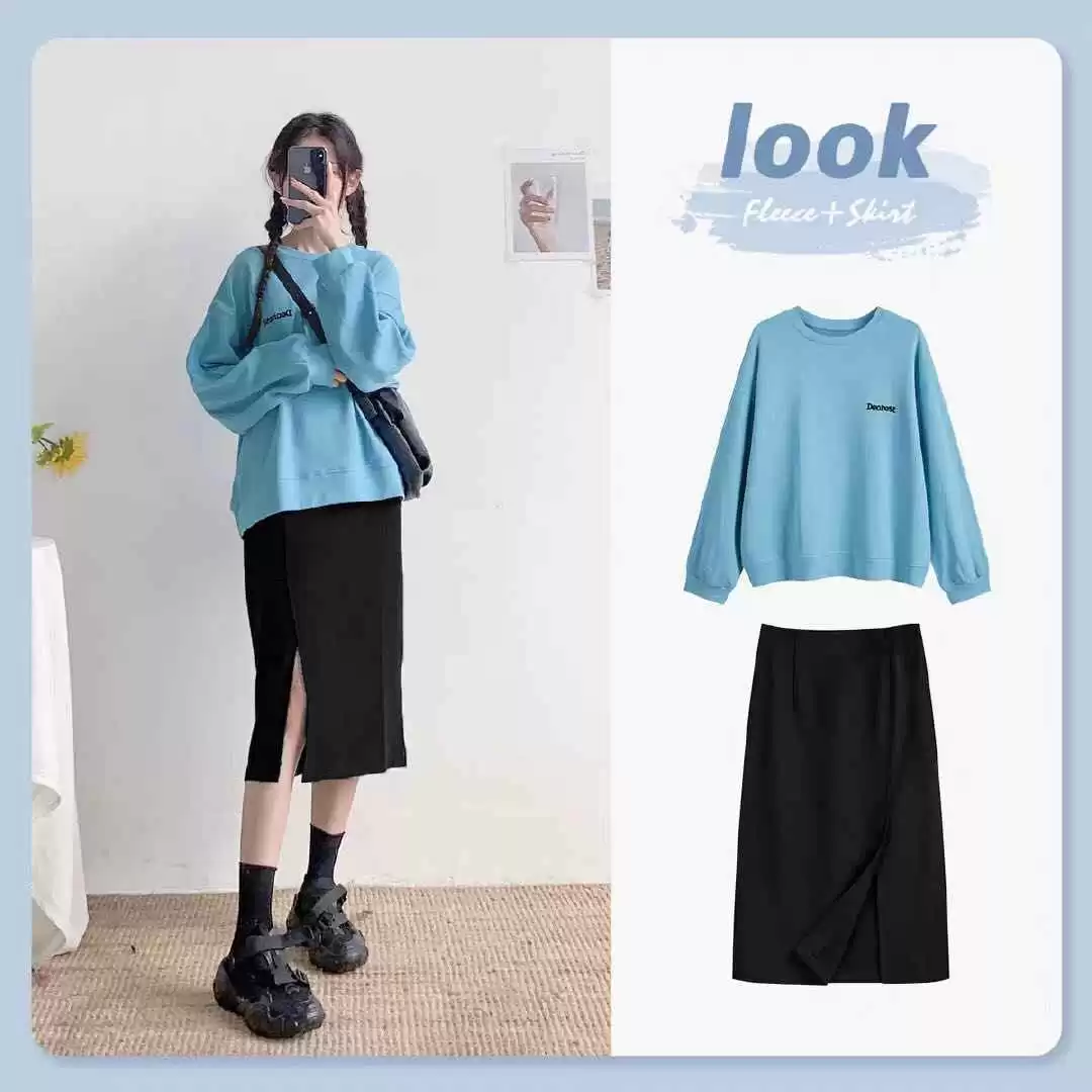 蓝色简约上衣搭配修身黑色半身裙,也很有味道,特别适合早秋。裙子是开叉设计,能凸显性感,更有女人味。这套不管是配运动鞋还是高跟鞋都合适,加个斜背包更精致。不仅能秀出大长腿,还能收获超高回头率!