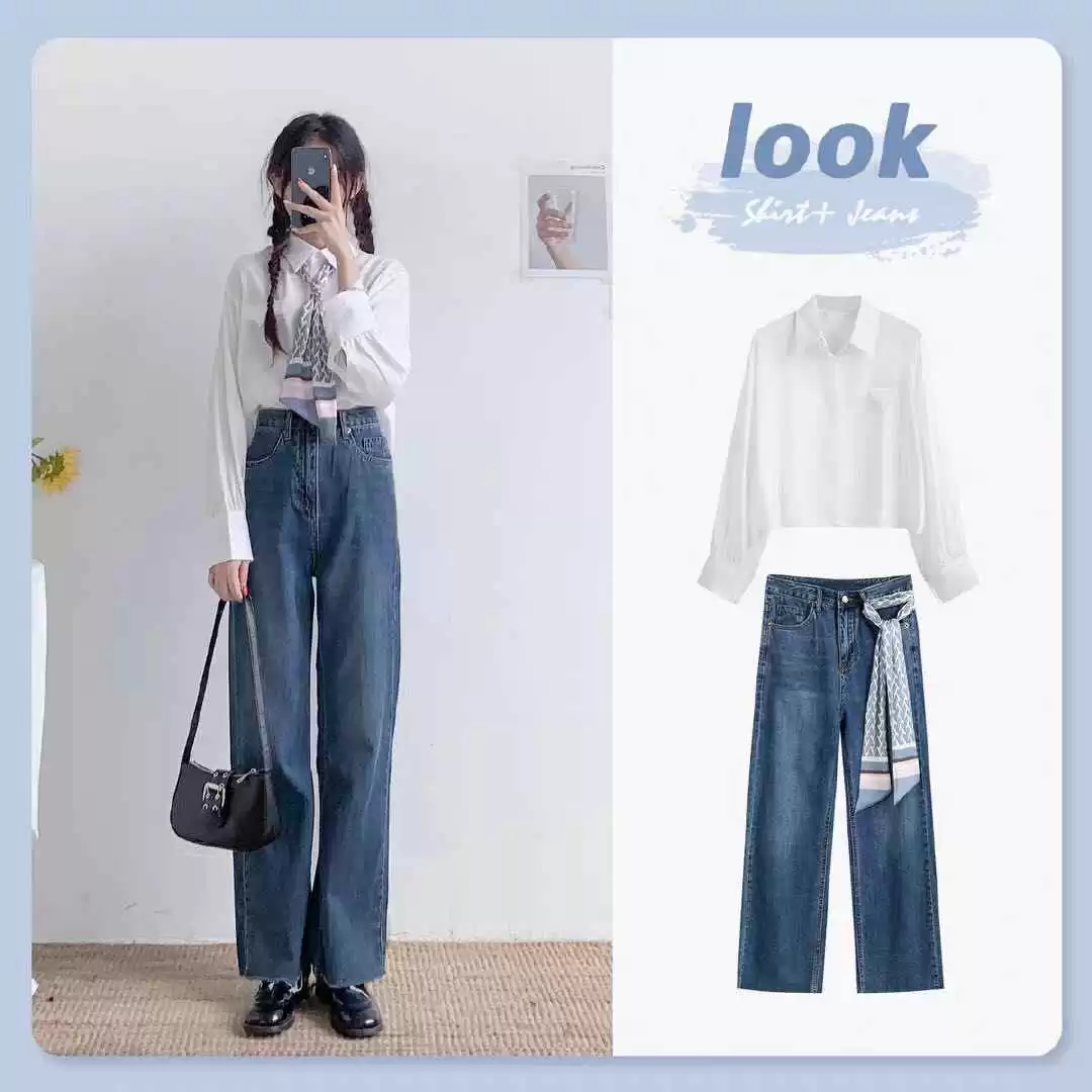 不只能选蓝色上衣,深蓝色经典牛仔裤也是好选择。可以搭简洁白衬衫,配一条宽松深蓝色阔腿牛仔裤,穿出简约高级感。选一双黑色皮鞋,带点复古气息。高腰裤显腿长,小丝巾增加活力,不同系法让造型更生动。
