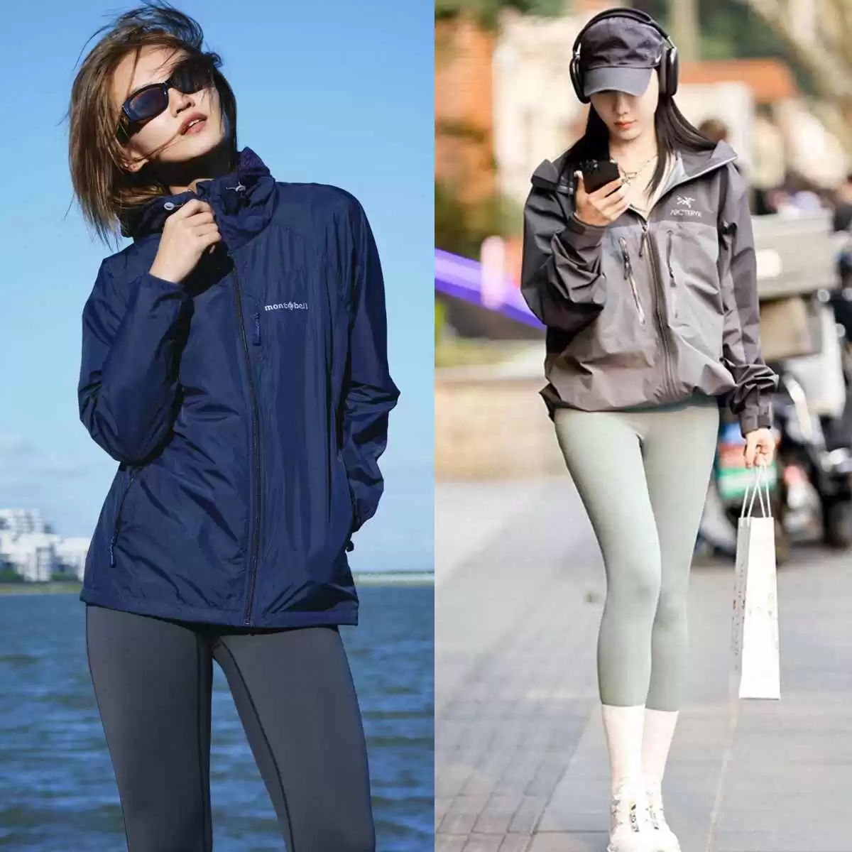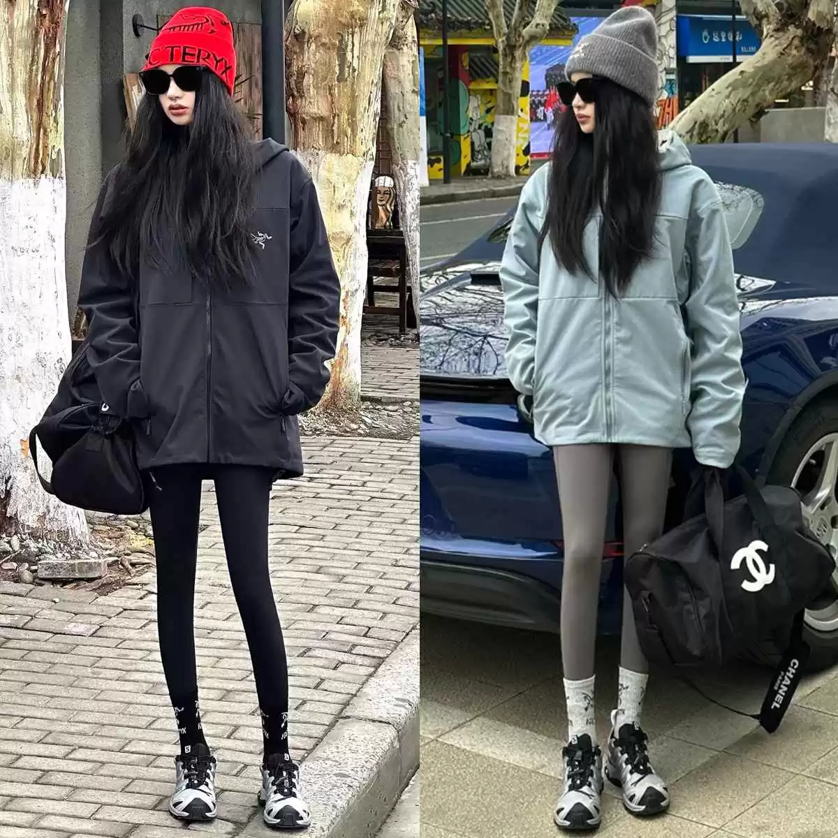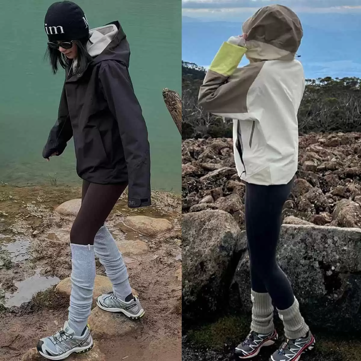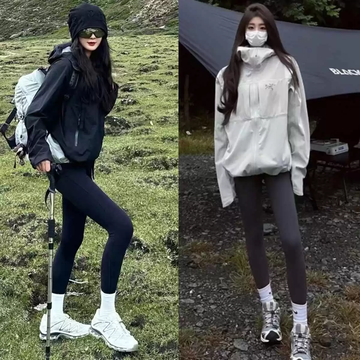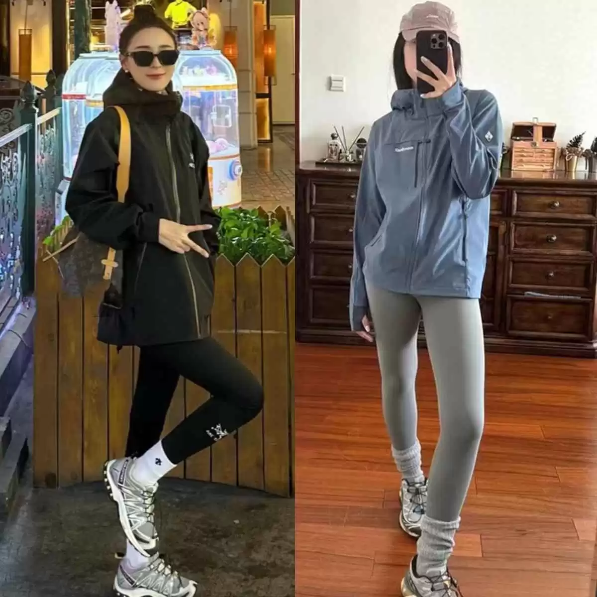 “冲锋衣+瑜伽裤+萨洛蒙”偏户外风,直接穿去上班可能有点违和。简单一招:在瑜伽裤外叠加袜套,这个小细节能中和风格,让穿搭更日常、更显瘦,瞬间提升潮流感。