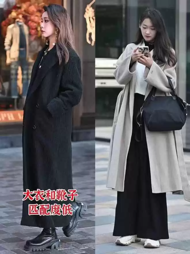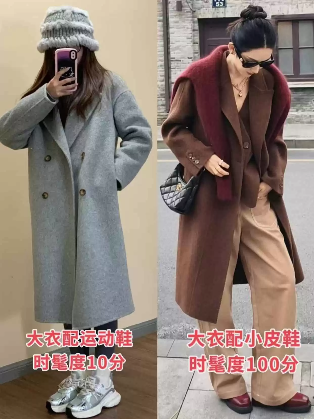 鞋子能定调整体风格。比如灰色大衣配黑色无痕裤和运动鞋,时尚度一般;但换成驼色大衣搭卡其色阔腿裤和棕红色皮鞋,立马高级感飙升。