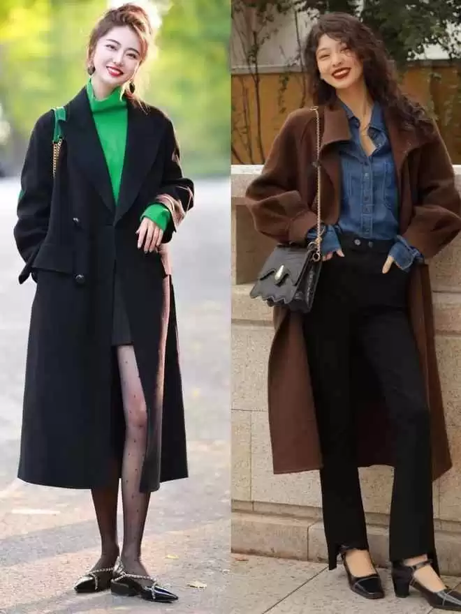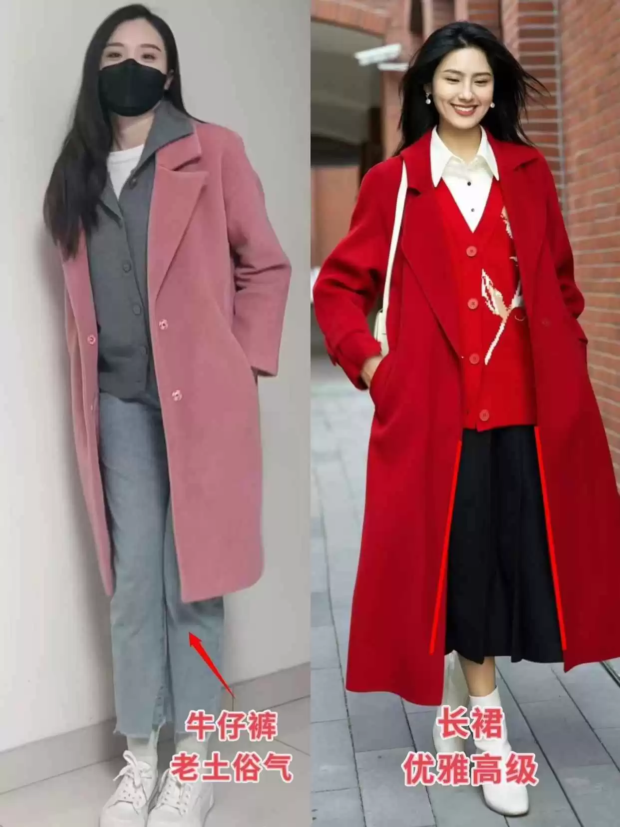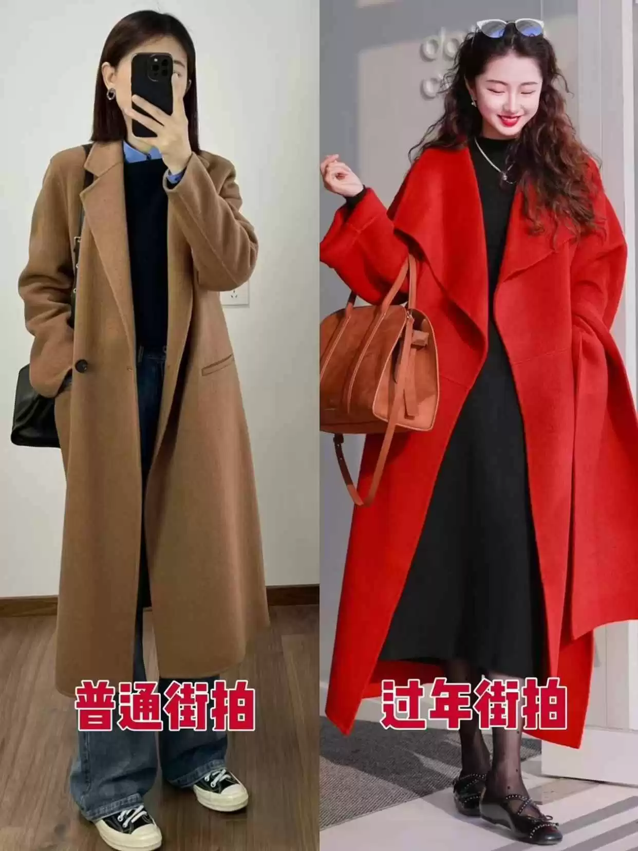 日常穿驼色大衣配牛仔裤和帆布鞋很随性;过年想喜庆点,大红色大衣内搭黑针织和A字裙,脚穿玛丽珍鞋,复古又洋气。