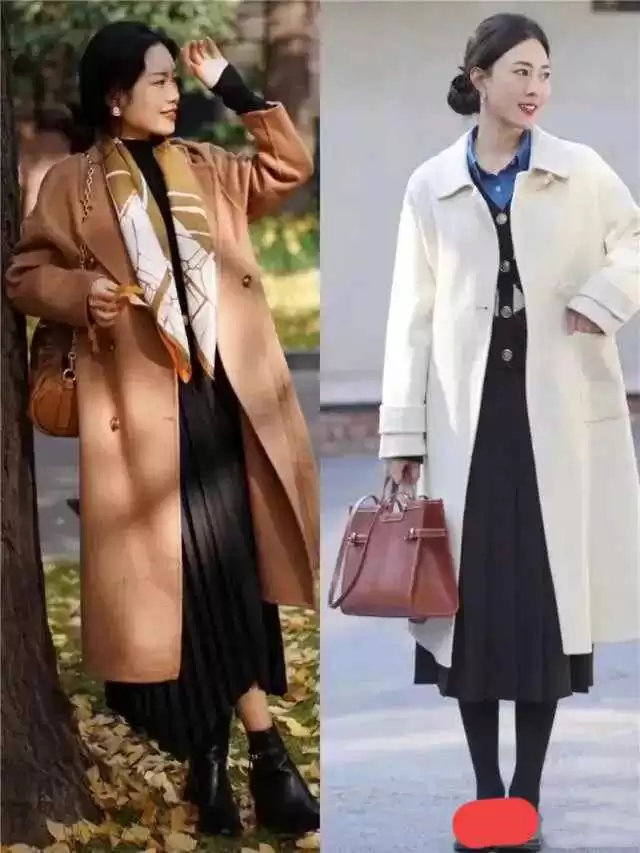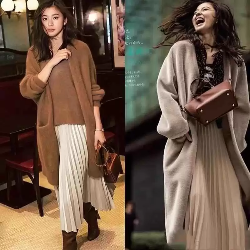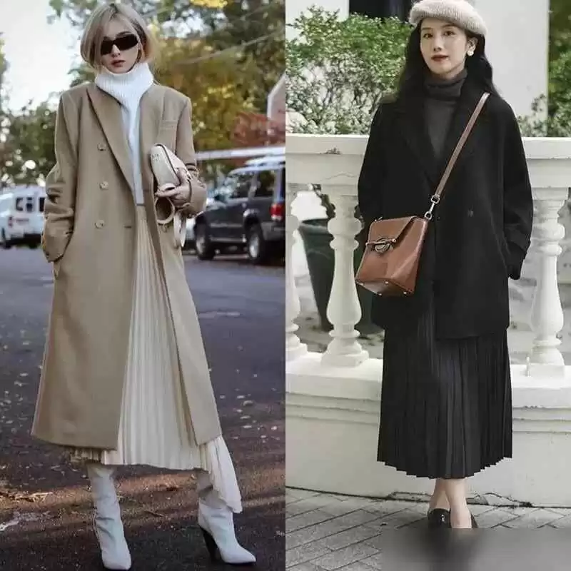 百褶裙对成熟女性或腿粗姐妹很友好,垂感好还显瘦。配灰色或驼色大衣,百搭又耐看。