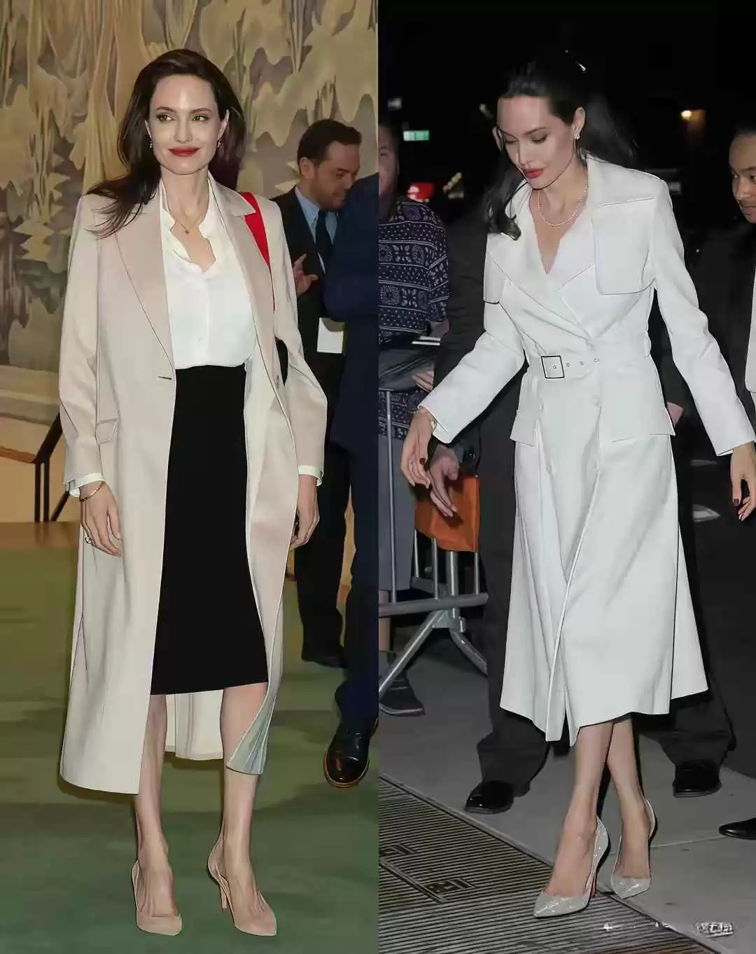 朱莉这类国际巨星常穿基础色,像奶白色大衣配白衬衫和黑色直筒裙,简单却高级。