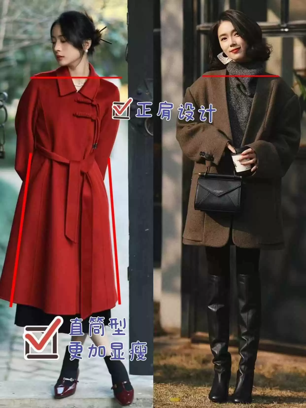像这件正肩红色大衣配黑色直筒裙和棕红色单鞋,显瘦又时尚。