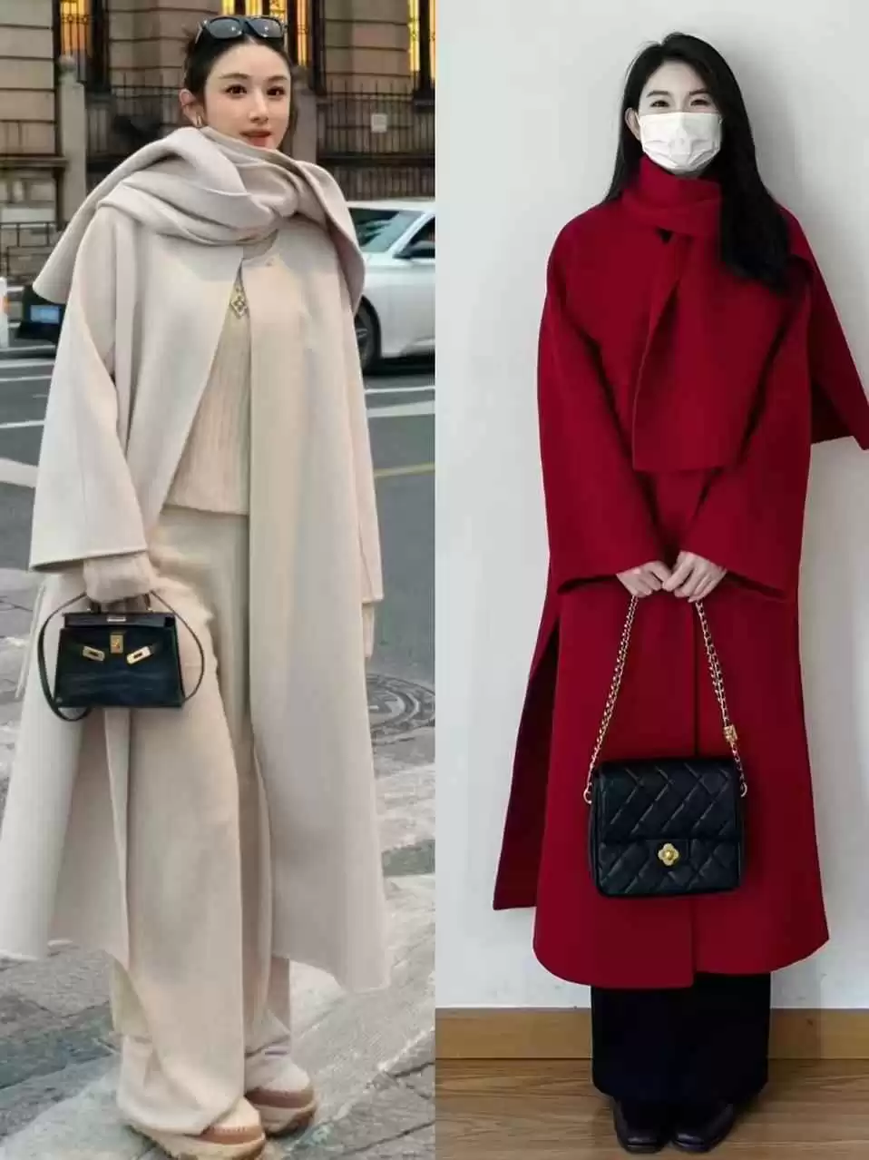 不一定要穿红色,米白色大衣搭燕麦色针织衫和阔腿裤,日常通勤更实用。
