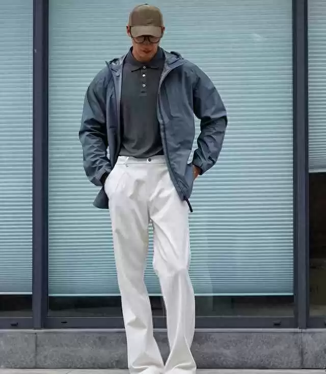 可以配牛仔裤,修身深蓝色款不错。上衣选短款夹克,显得精神。如果个子高,试试工装裤,多口袋设计更潮。