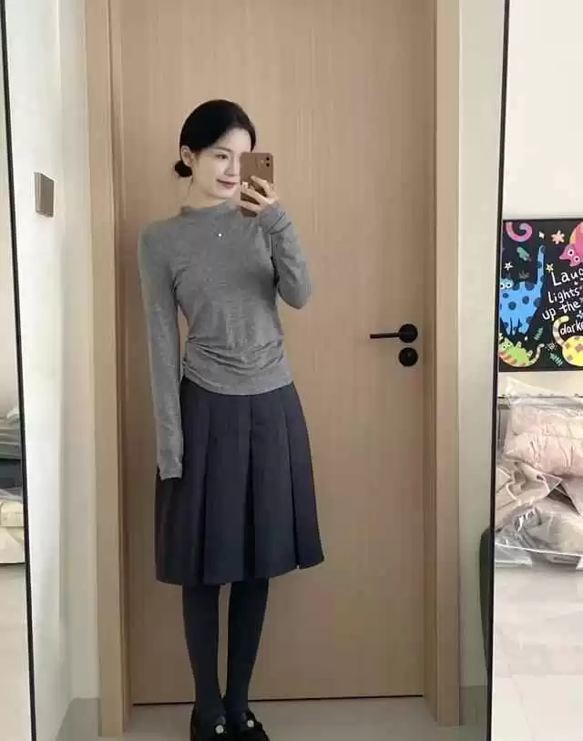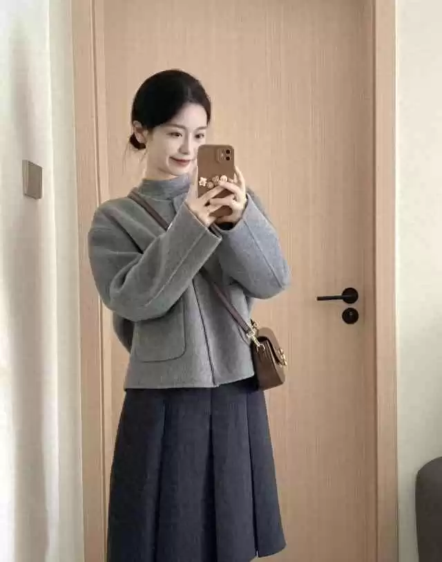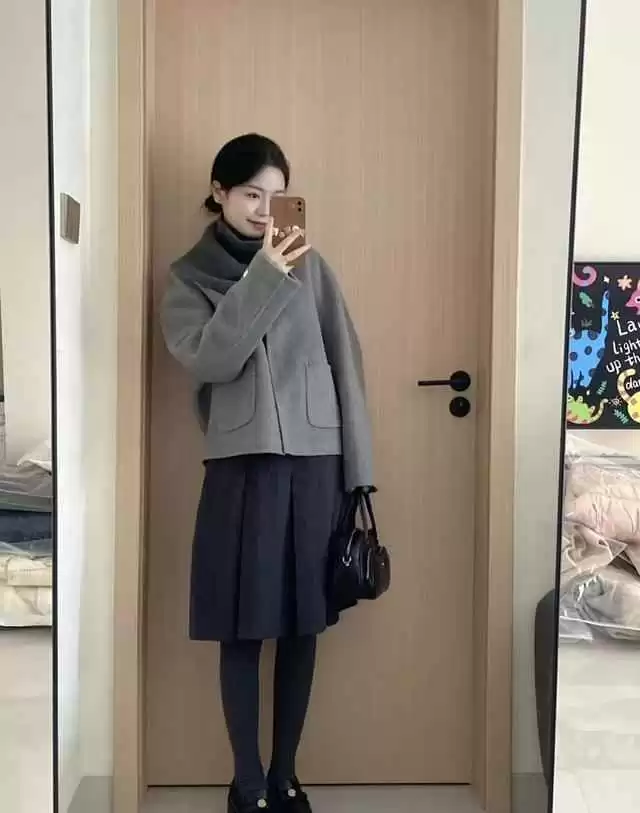 灰色短款呢子外套+百褶裙,韩系温柔风简约又高级