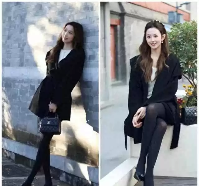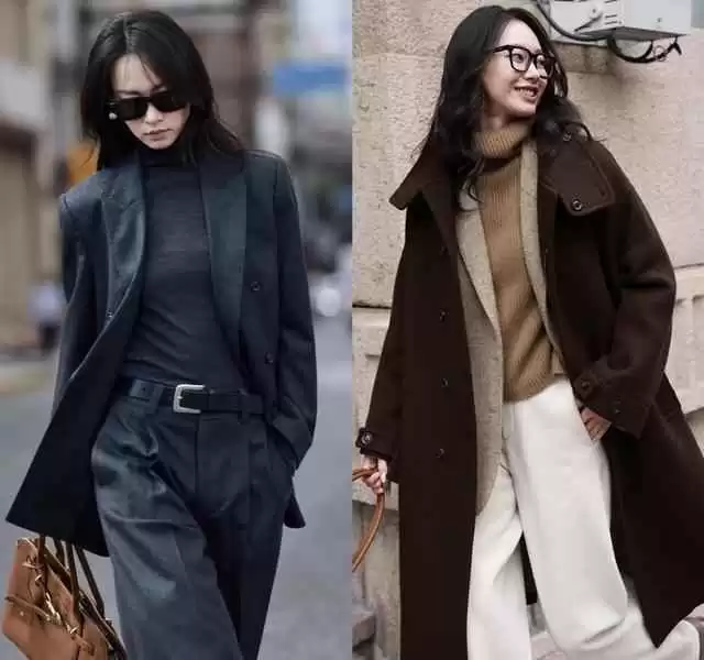 先看最吸睛的“黑呢大衣+黑裤”组合。