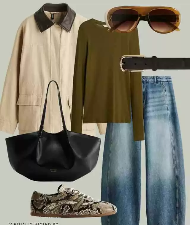 必备单品里,工装风中长夹克和做旧高腰牛仔裤不能少。