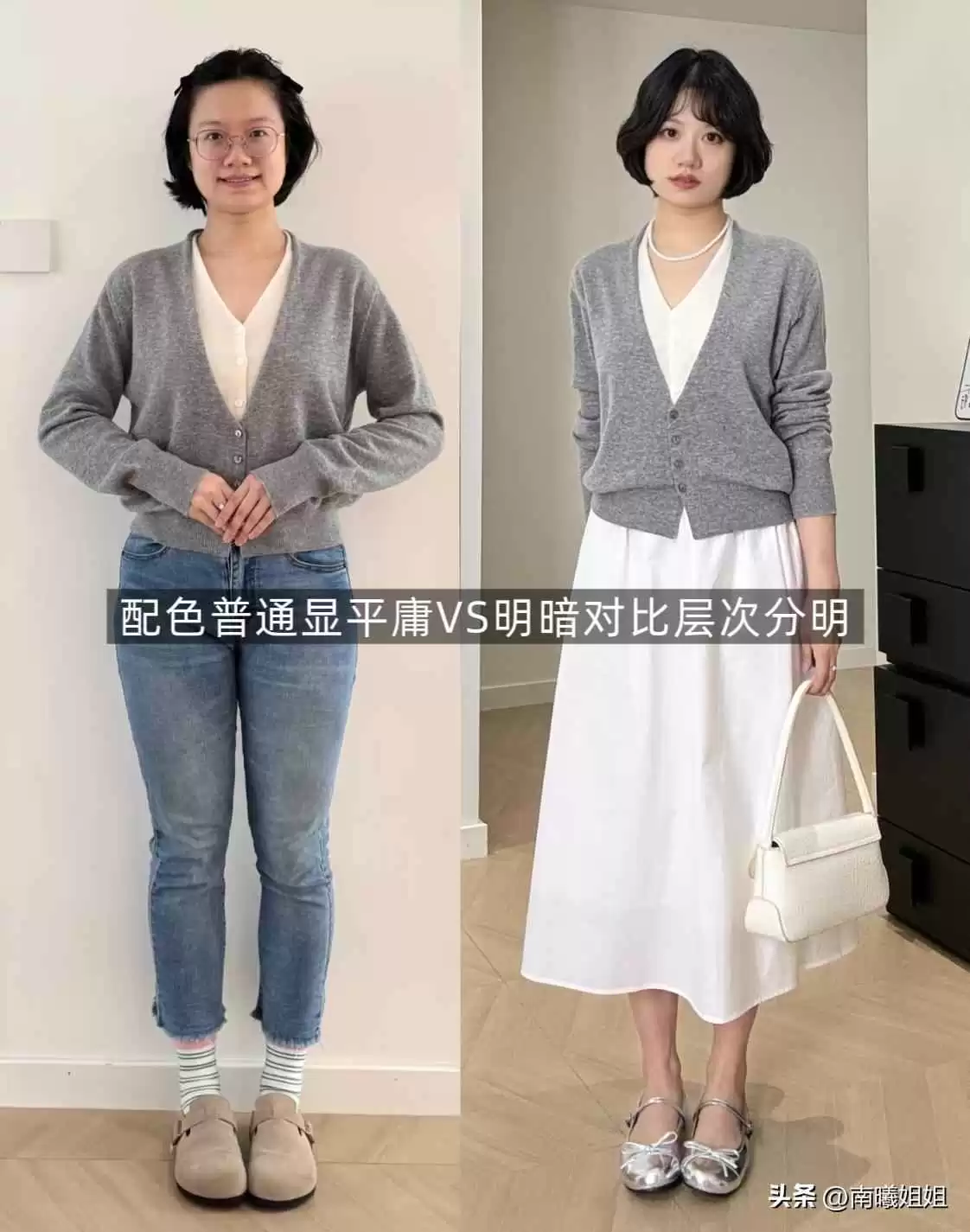 看看这组对比图就明白,同样是灰色针织衫,配蓝色牛仔裤,感觉就很一般;但换成小白裙,颜色和内搭呼应,立马高级又提气质。