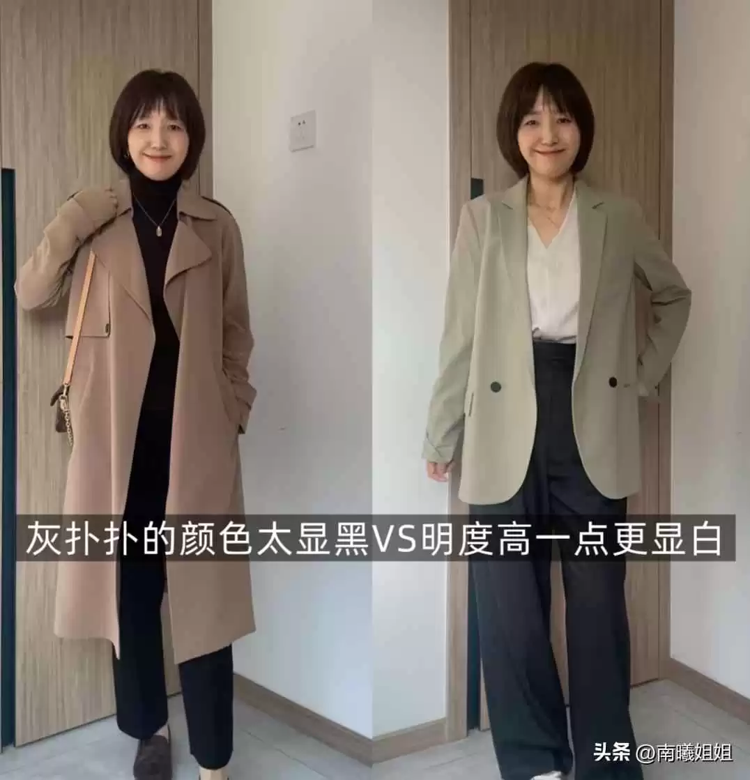 颜色太扎眼确实挑皮肤,但也不能选灰扑扑的色调,特别是主要单品。如果用深灰、深棕这些暗色,不仅气色差,皮肤还显暗沉。