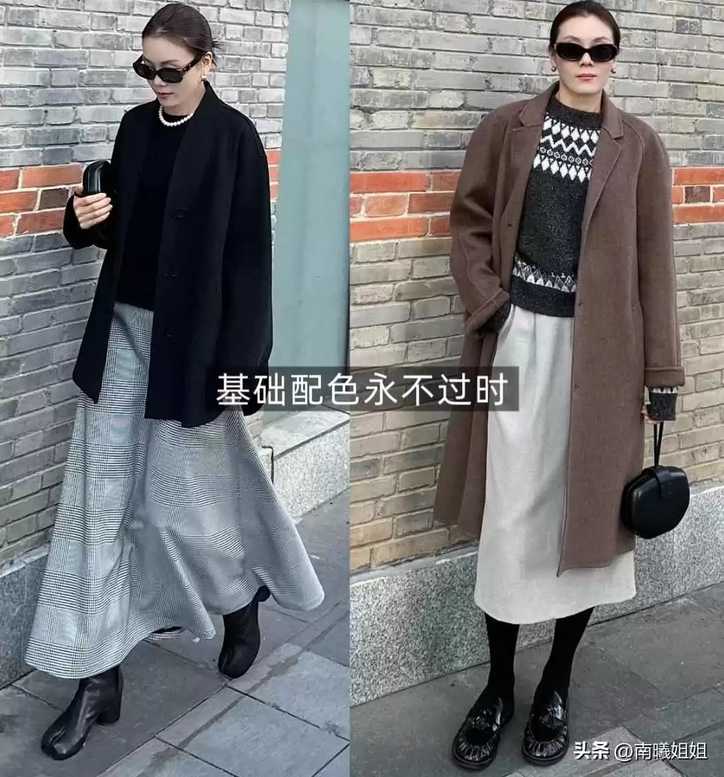 基础色单品很适合叠穿。比如黑色毛呢外套,可以内搭各种浅色或彩色衣服,适配度高,还能平衡造型。或者配一条彩色长裤或长裙,基础色占主导更显高级。