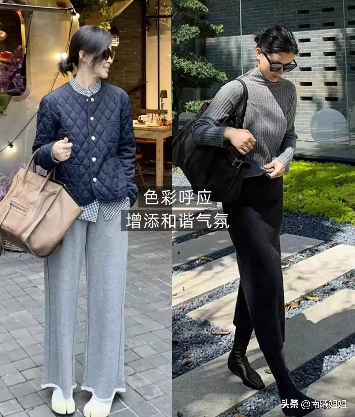 有时候,光靠颜色还不够,得加点时髦元素。尤其是颜色深的上衣,别再配小黑裤了,显得老土还没品位,两件都是基础款,容易穿成路人甲。