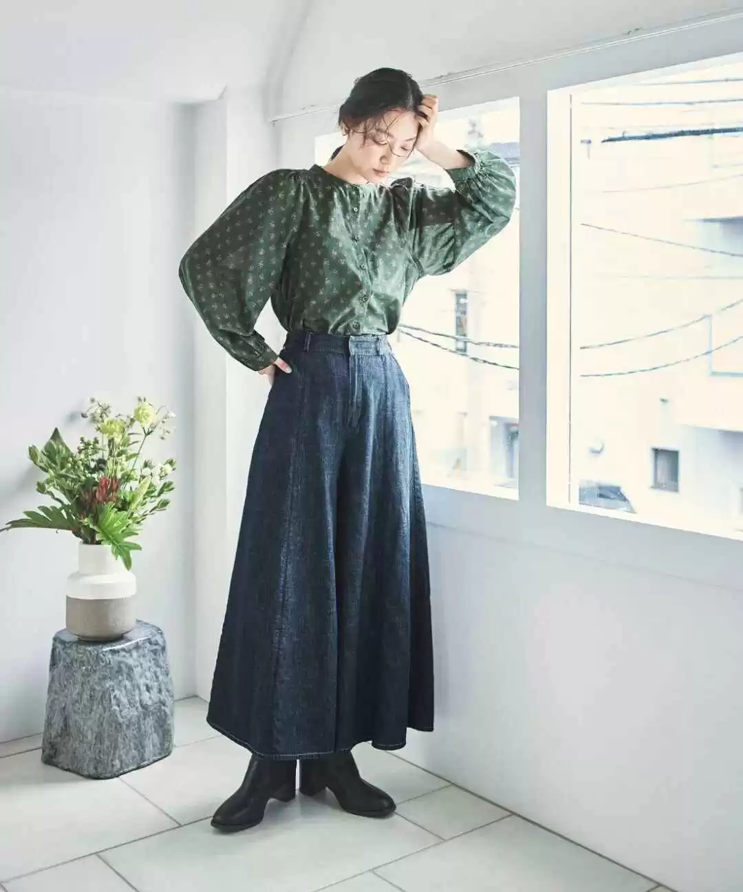 墨绿色的无领衬衫,充满了大自然的活力与清新感,还带着复古的韵味,配上一条牛仔中长裙,轻松打造出休闲又自然的森林风格。