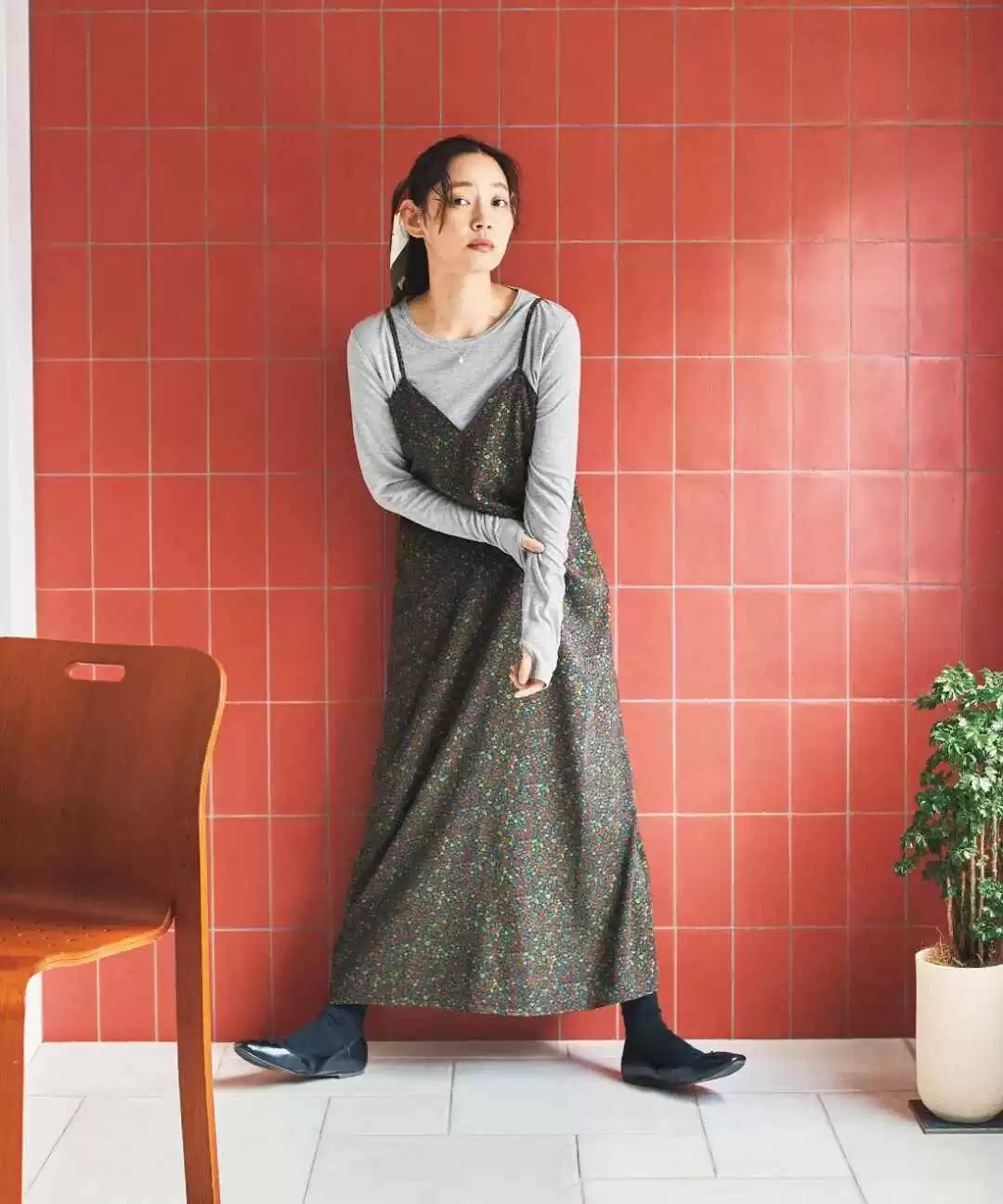 灰色打底衫低调舒适,不抢风头,搭配色彩柔和的碎花吊带裙,打造出不经意的美感。