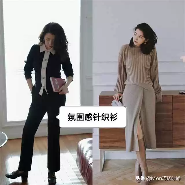 小香风修身款配直筒裤,干练有型;普通卡其针织衫搭针织裙和长靴,显贵又气质。