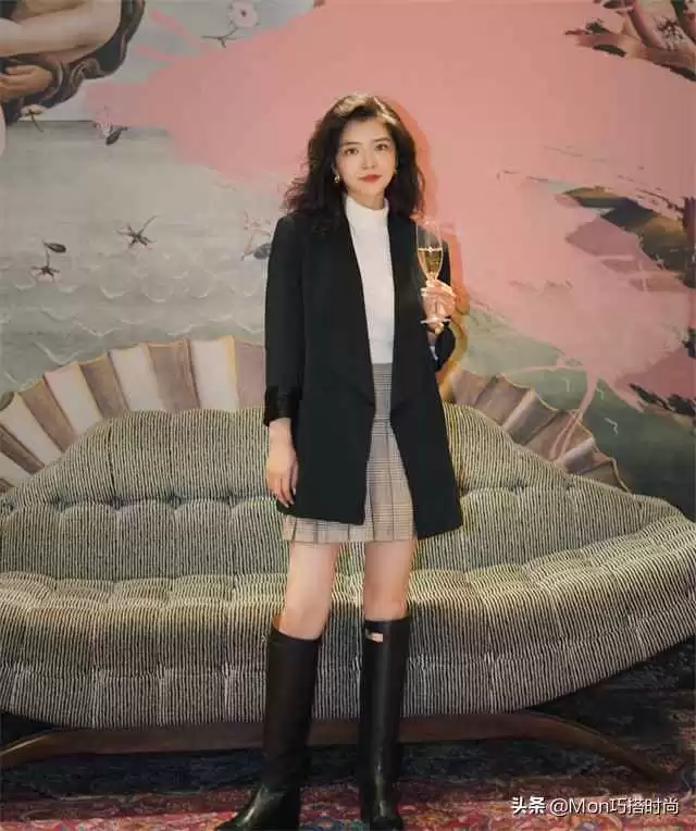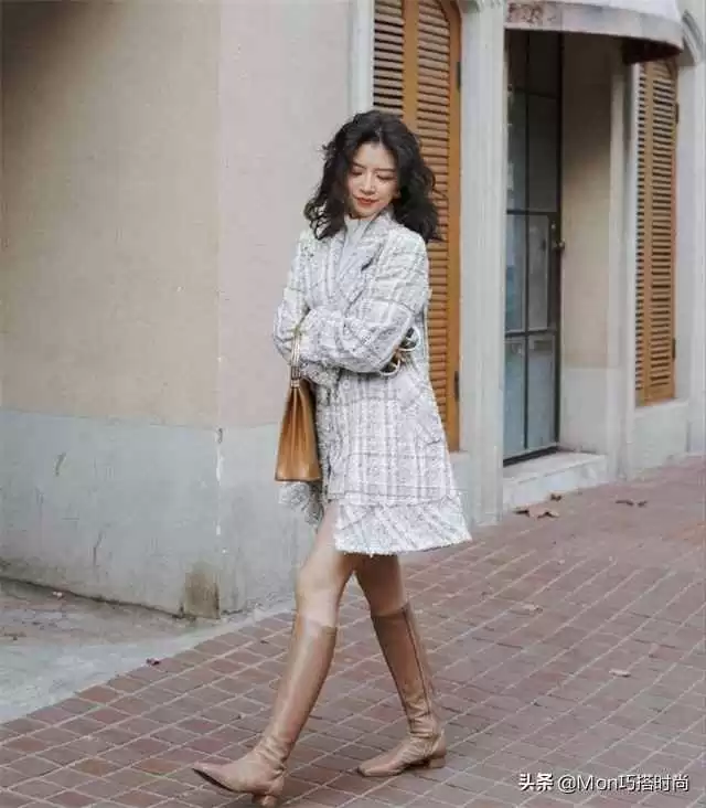 三木的小香风外套偏名媛感,但配棕色皮包和长靴,混出复古时尚风,意外好看!