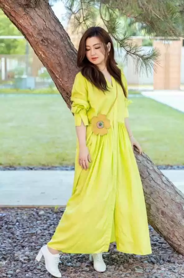 连衣裙颜色选择多,夏天常见黑白浅蓝,但亮黄色穿的人少——毕竟亚洲女生多是黄皮,穿不好容易显黑。皮肤白的妹子就能轻松hold住,像Selina这款黄裙,V领设计不挑身材,谁穿都显瘦。