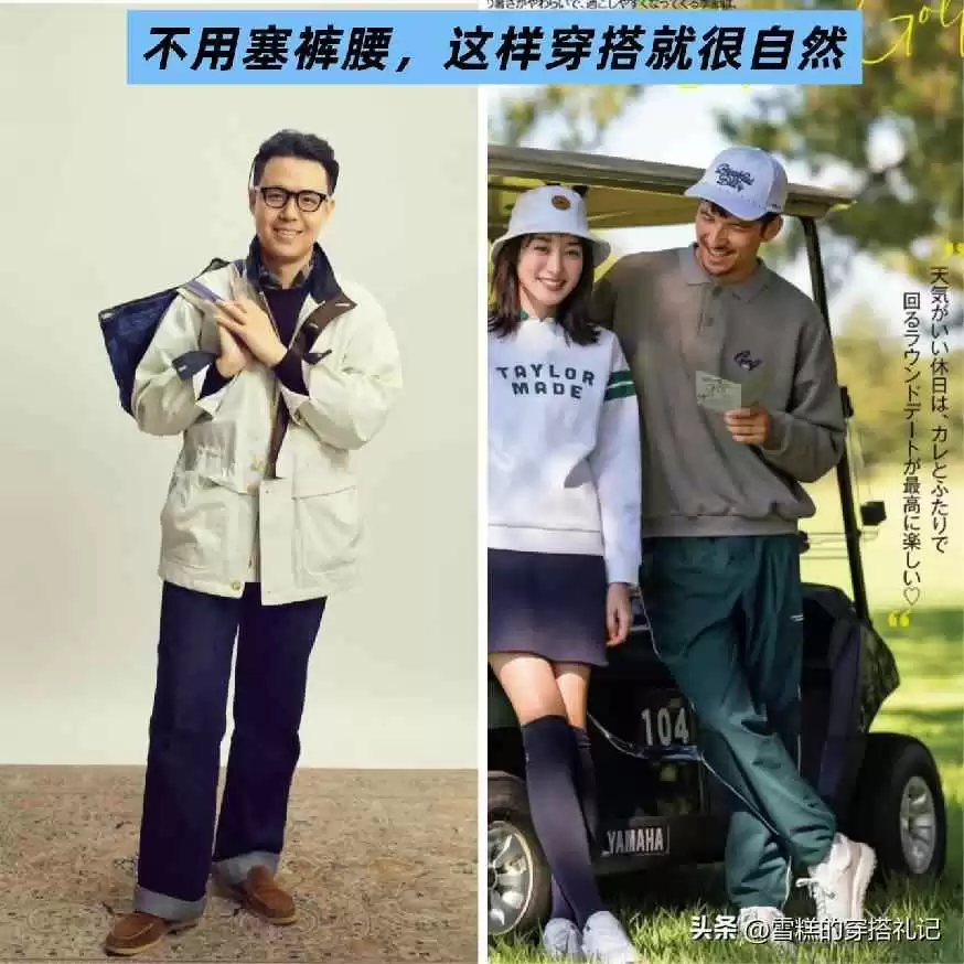 从对比图能明显看出,塞不塞裤腰效果天差地别。塞裤腰会突出腰部线条,对中年发福的男士特别不友好,啤酒肚、腰腹赘肉分分钟现形。而不塞裤腰的穿法能自然遮掩身材问题,整体更松弛。