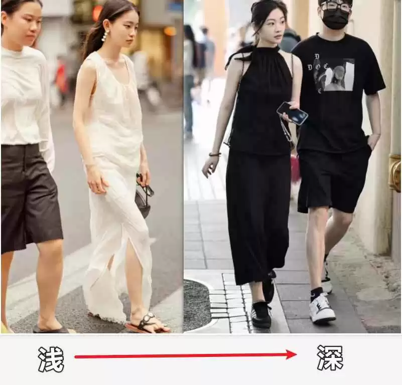 注意,搭配时颜色最好从浅到深,靠近脸部的颜色要亮一些,能提亮肤色。深色放在下半身,保持重心下沉,避免头重脚轻。