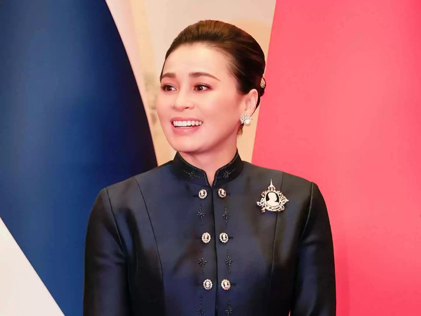 苏提达王后穿搭惊艳全场,蓝色丝绸礼服尽显王室风范