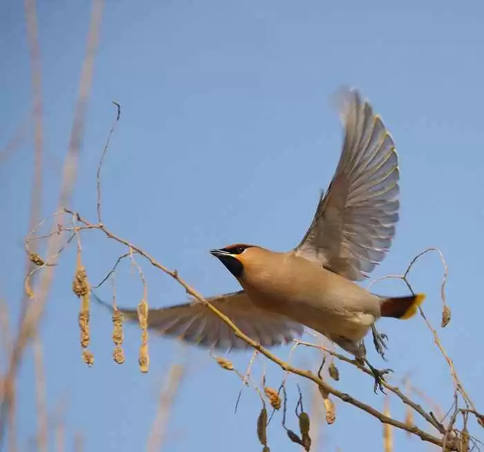 太平鸟的羽毛主要以灰褐色为主,但细节处很精致:背部灰褐色,腹部颜色稍浅,翅膀上有一道白色斑纹,次级飞羽末端还有红色蜡状斑点-1。最吸睛的当然是它那十二根尾羽末端的鲜黄色,飞起来的时候,就像拖着一道金色的光芒。
