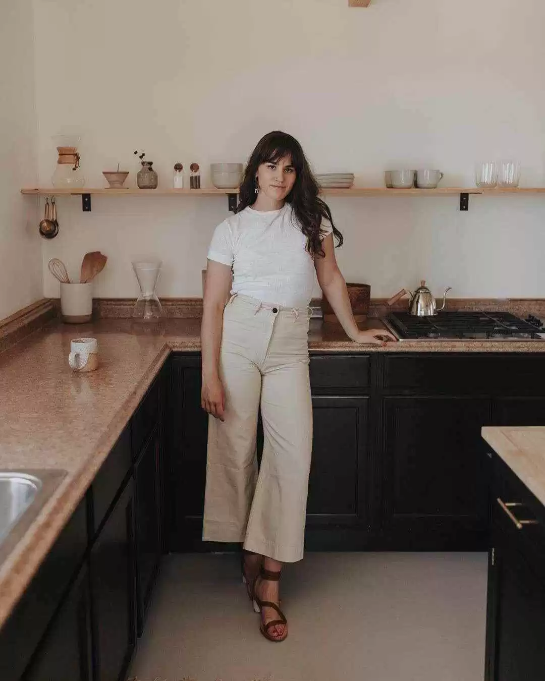 那全身浅色呢?同样暴露缺点,比如白T配米裤,小腹尴尬。▼