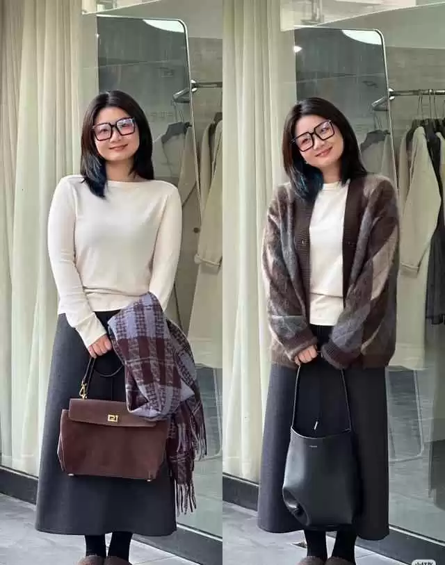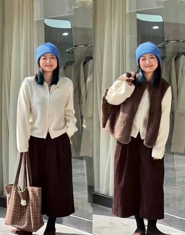比如烟灰蓝毛衣配深海蓝牛仔,同色系但深浅分明,脸部被提亮,下半身自然后退,整体更协调。