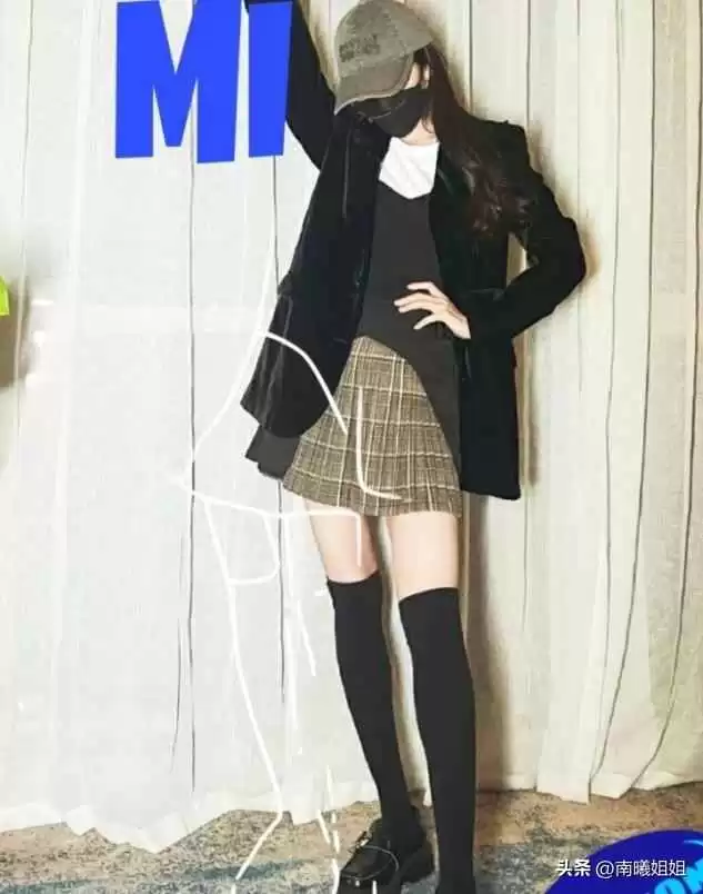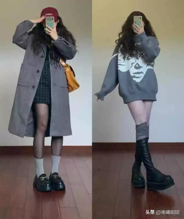 ○造型亮点:短裙能露腿,展示腿部线条,视觉上自然显高。乐福鞋配长袜,能替代长靴效果,避免厚重感。