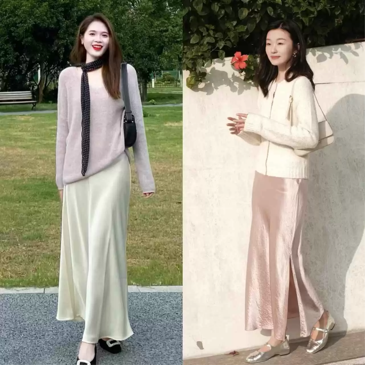 想要在秋天穿出成熟优雅的气质,毛衣和缎面裙的组合绝对不能错过。缎面裙垂坠感强,能完美展现身材曲线,行走时裙摆飘逸,尽显婀娜多姿。尤其是过膝长度的缎面半身裙,更显大气成熟,搭配浅口单鞋,自然散发精致女人味。