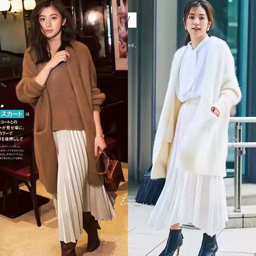 如果想显瘦增高,可以尝试高腰过膝百褶裙,露出脚踝,行走时优雅飘逸,显瘦效果加倍,轻松穿出高级质感。