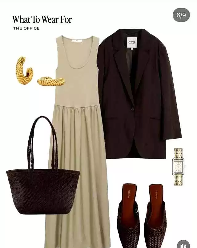 深褐色西装配橄榄绿裙子那套,我看得有点懵。像我老家安徽的人说,穿这样去菜市场,肯定有人问是不是要上电视。金灿灿的耳环,嘴上说着职场松弛感,其实谁不是为生活奔波呢。