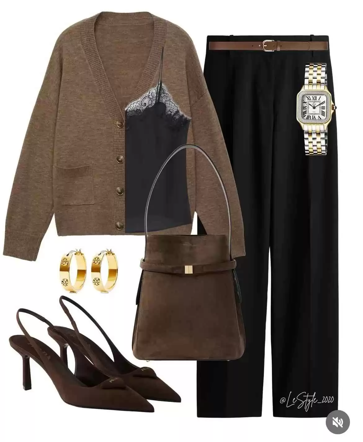 想穿出成熟感不一定要靠西装!试试树木棕色的宽松针织开衫,自带沉稳气质。搭配同色系的尖头高跟鞋和小巧单肩包,看似随意实则高级感满满。