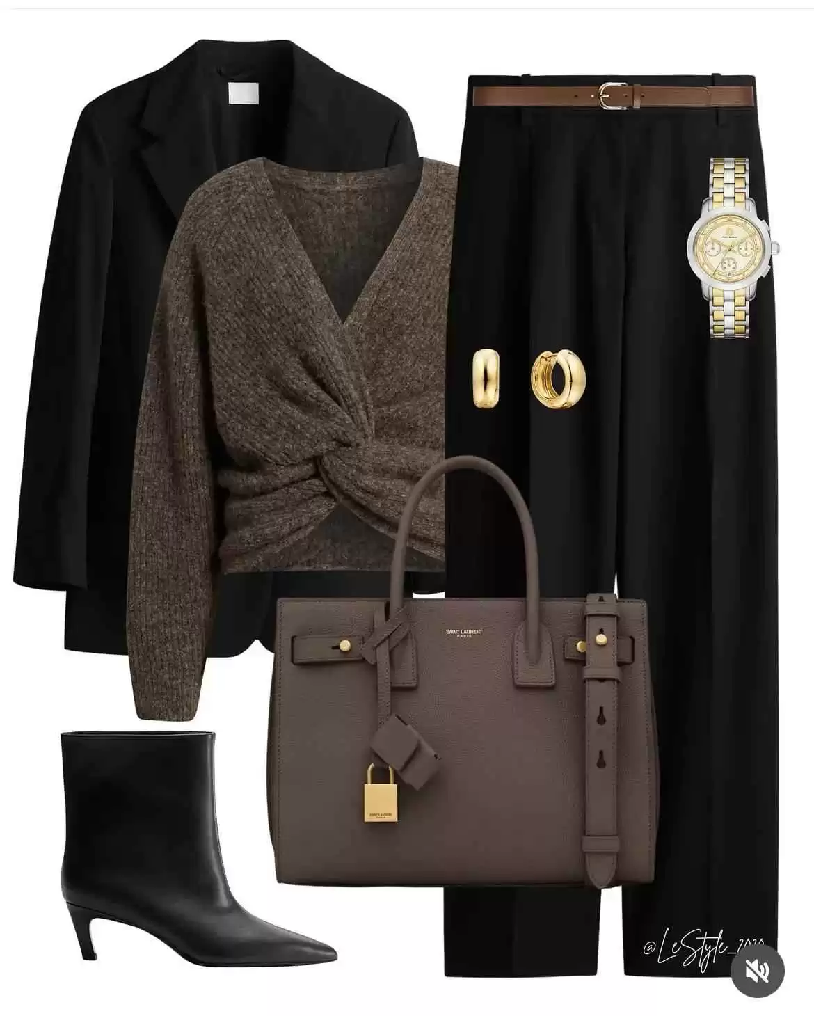 基础黑西装也能玩出新花样!在腰间打个结增加层次感,让深色针织衫不再单调。用金色饰品提亮整体,配上细跟短靴,经典穿搭瞬间升级。