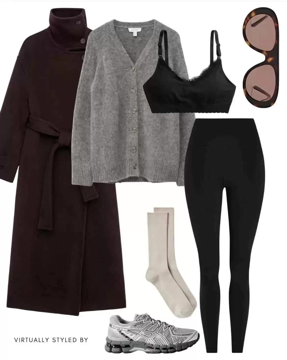 一件半高领长款大衣就能轻松穿出高挑感!直接套上中长针织开衫,搭配瑜伽裤和运动鞋,舒适又时尚,出门遛弯或逛街都合适。