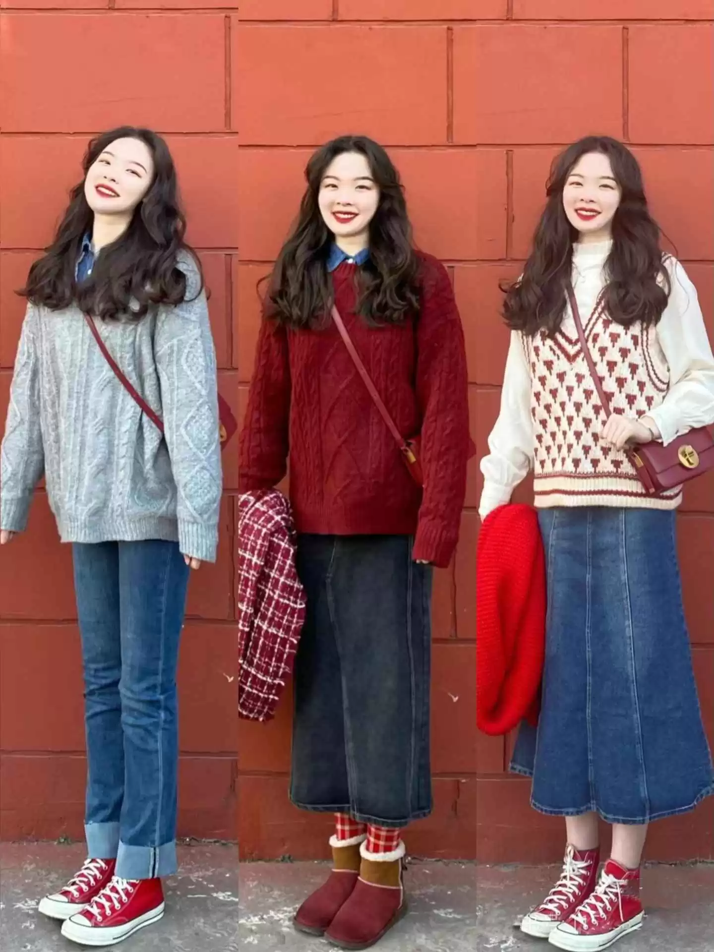- 毛衣:红色宽松毛衣+黑色紧身裤+黑色短靴,简单却亮眼;橙色针织开衫适合温柔风格,内搭白衬衫就很出彩;