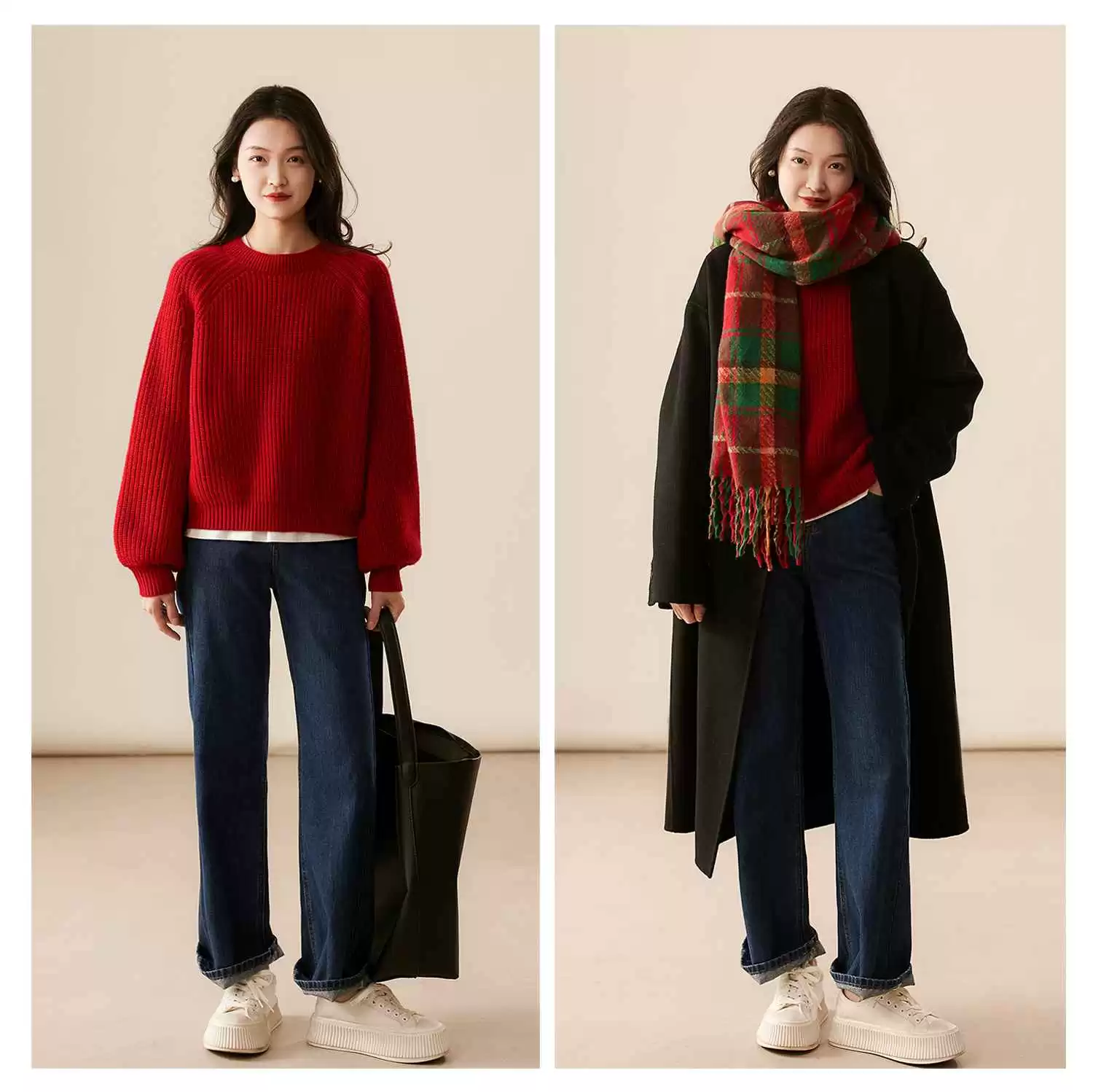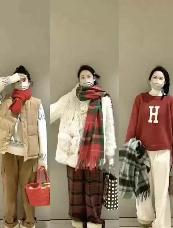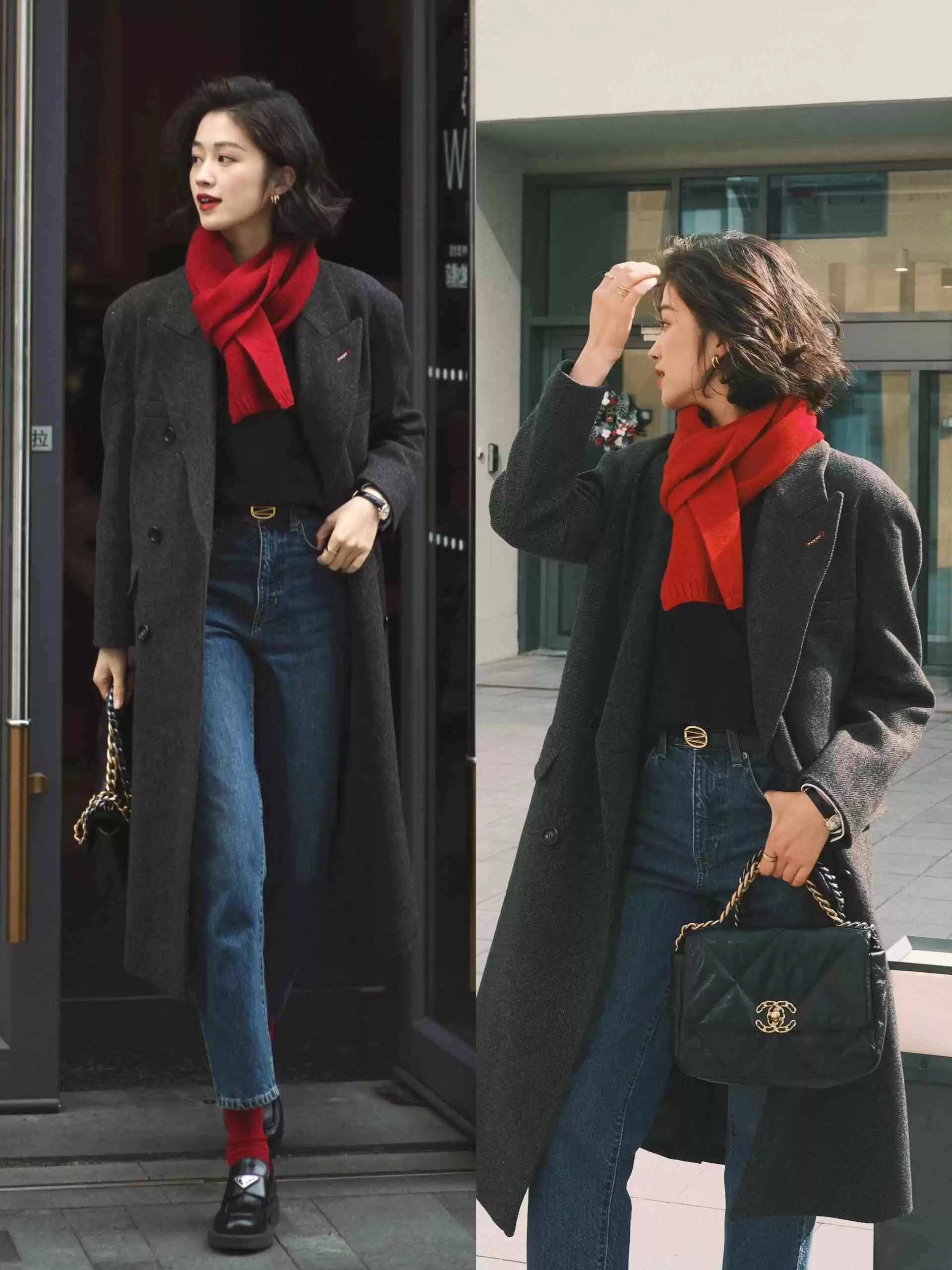 - 同色系深浅搭:比如深红色外套+浅红色内搭+红色围巾,层次丰富,不刺眼;