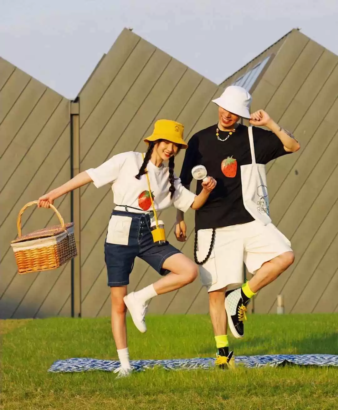 夏天最适合走青春活力风,因为看起来清爽又日常,不挑身材,特别适合情侣出门。 卡通图案T恤是打造少年感的关键,女生可以搭配短款突出腰线,男生用简约衬衫加持,干净又有型