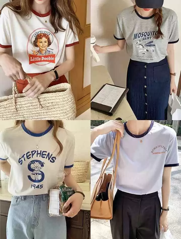 闺蜜装的高级玩法是各有风格,T恤就是打造个性又和谐的最佳单品。像这种多色多图案的设计,每款都有独特夏日感,撞色设计比普通T恤多了几分韩系清新范,搭配短裤长裙都好看
