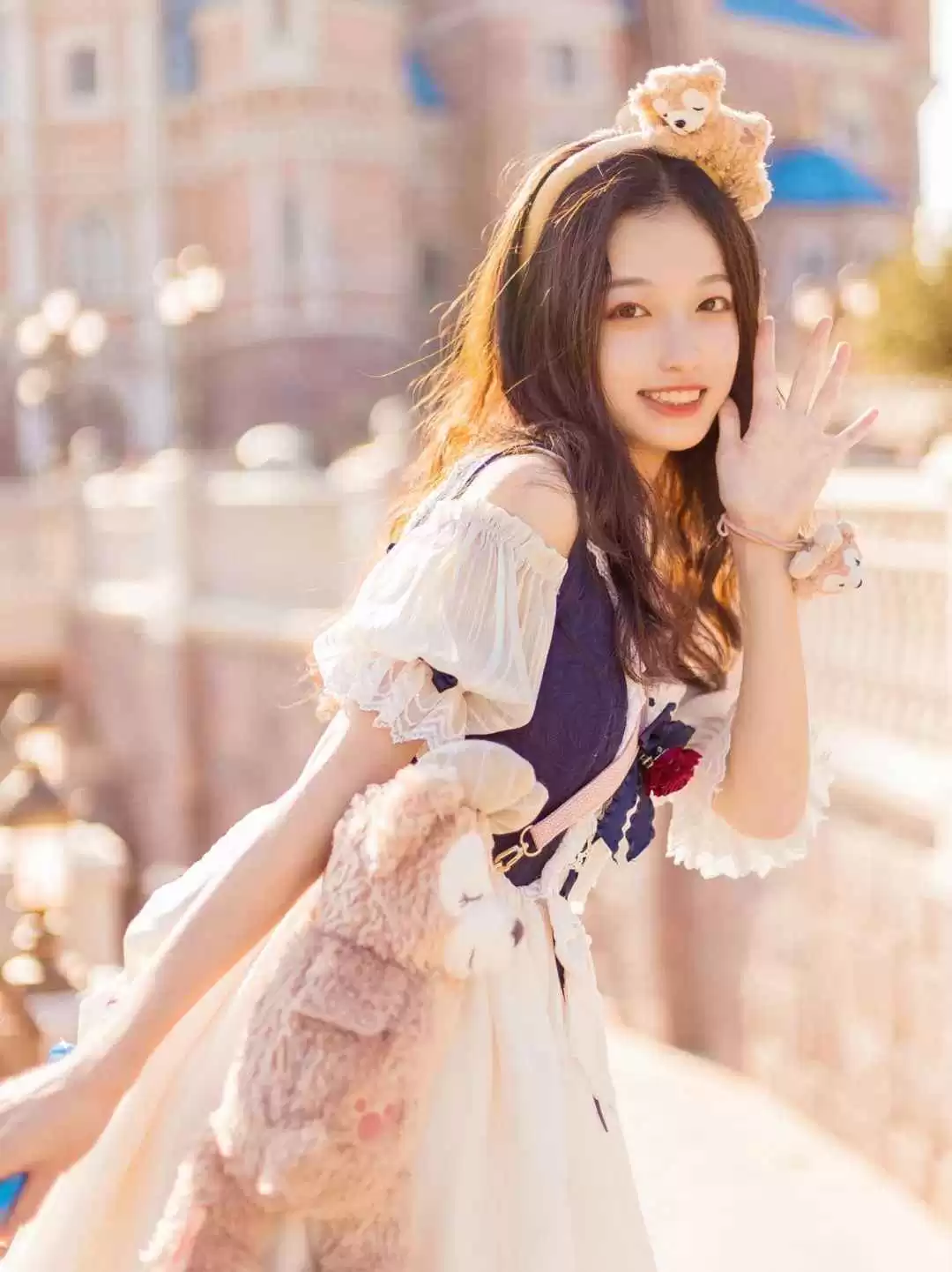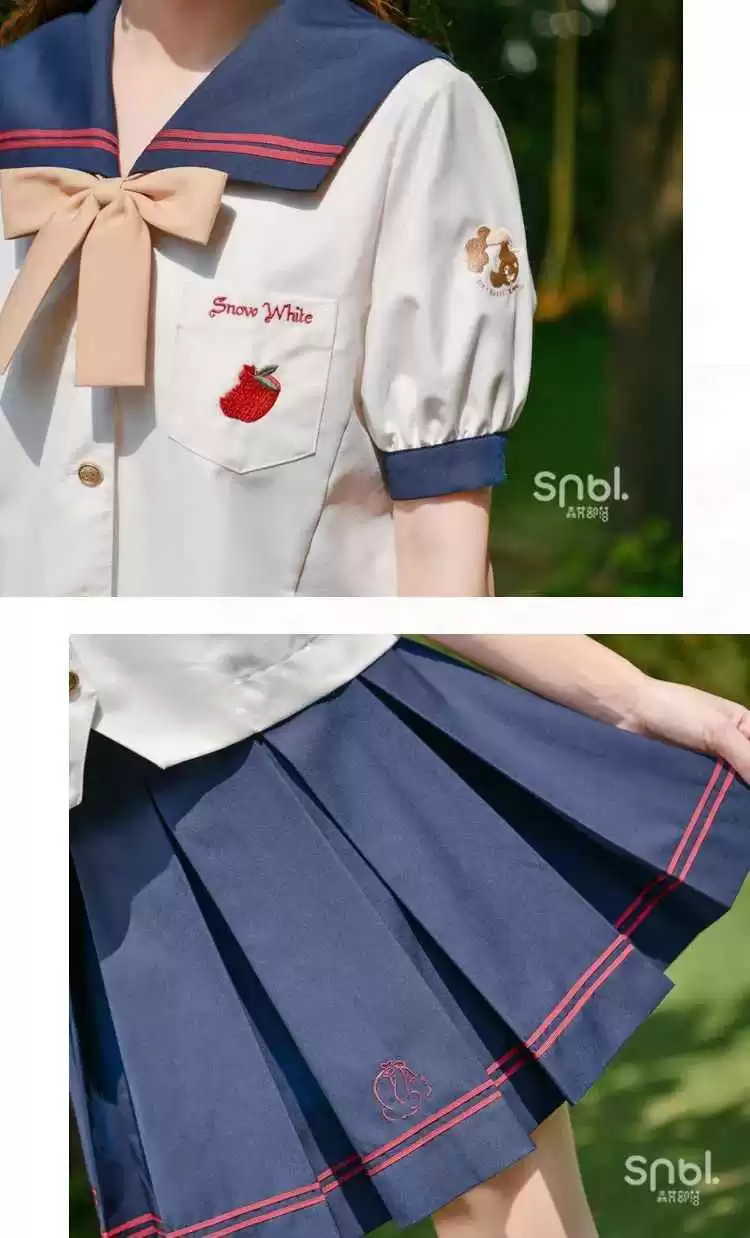 JK制服因为减龄又上相,成了游乐园的热门穿搭。这款联名款用了白雪公主的经典蓝色,裙子上还有红苹果刺绣,穿上就是童话里的公主本人!