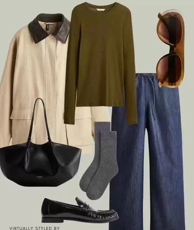 比如职场通勤,可以试试发热科技的立领毛衣配微喇神裤,剪裁利落还保暖,加上厚底乐福鞋和大号防水托特包,专业又实用。