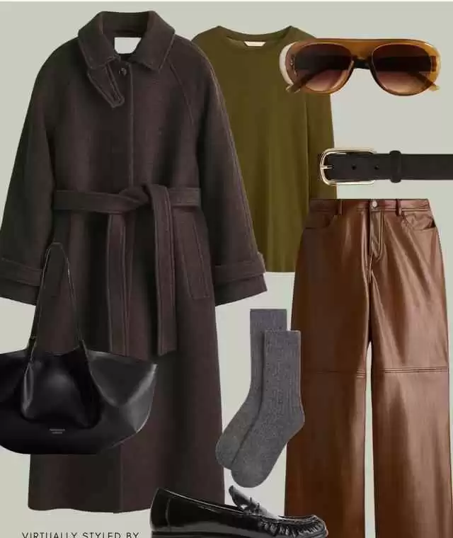 想要高级感?羊毛混纺大衣配环保素皮皮裤,焦糖咖皮质和黄铜纽扣点缀,细节满分,秋冬温暖色系穿出质感。