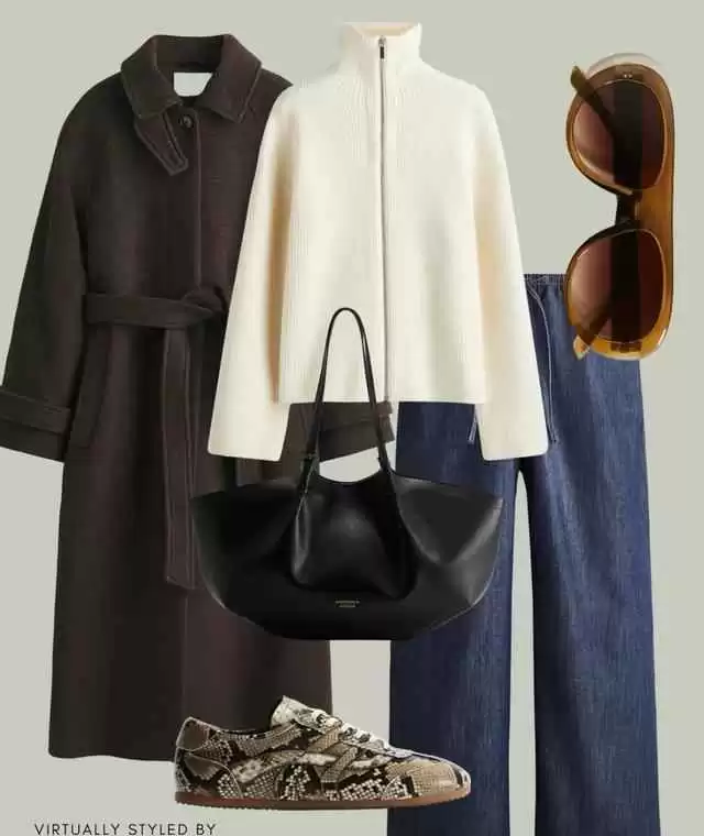 或者选一件环保米色外套,内搭深海蓝羊毛毛衣,配上原色牛仔裤和方头踝靴,舒适度满分的同时提升整体档次。
